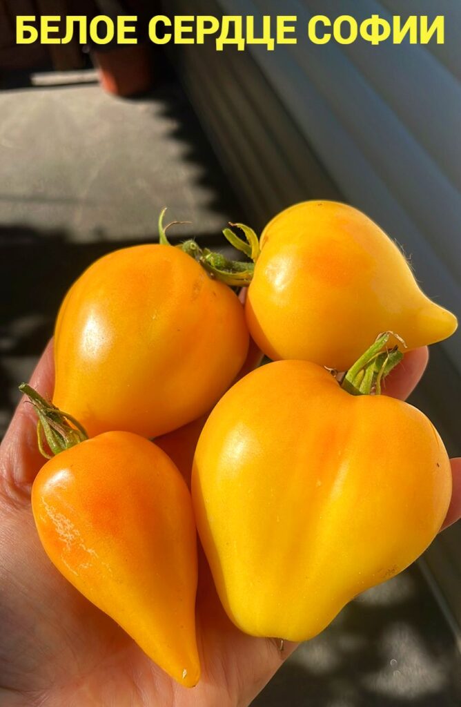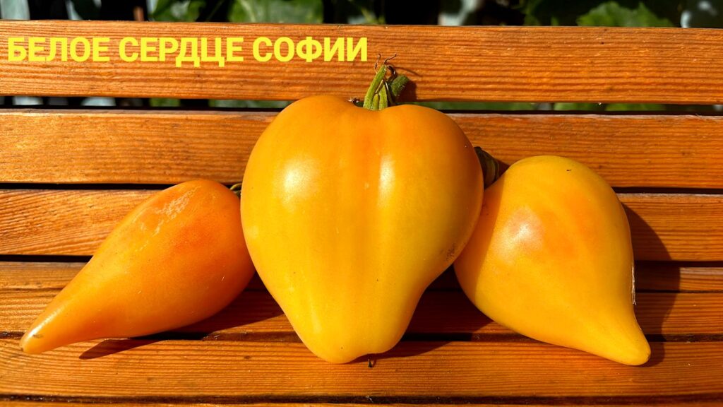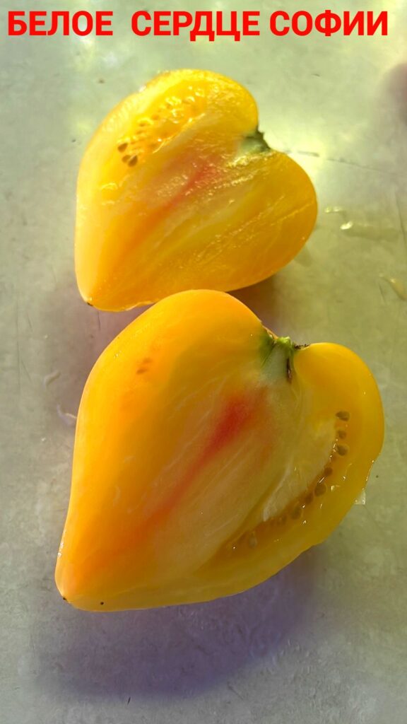 Кремово-желтого окраса, плотное сердце красивой утонченной формы. На некоторых плодах внутри проявляется легкий красный галстук. со второй половины сезона плоды набирают более насыщенный цвет и более насыщенный вкус, оставаясь даже при долгом нахождении на кусте плотными, идеального вида и вкусными.