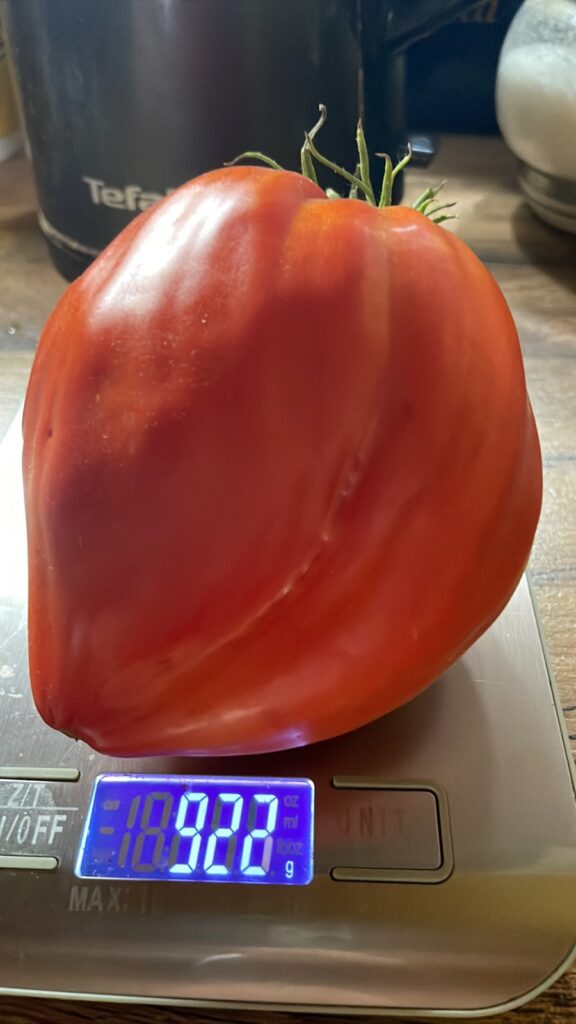 Куст соответствует размеру плодов: 1,9 м. в открытом грунте, крепкий, сильно облиственный, с толстыми стеблями. Плодов на кусте много, в кисти 3-5 плодов весом 400-500 грамм. Со второй кисти и дальше плоды идут намного крупнее, 700-1000г!