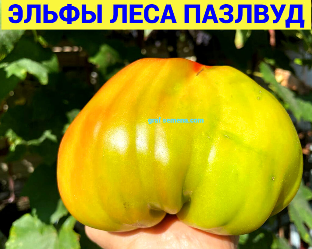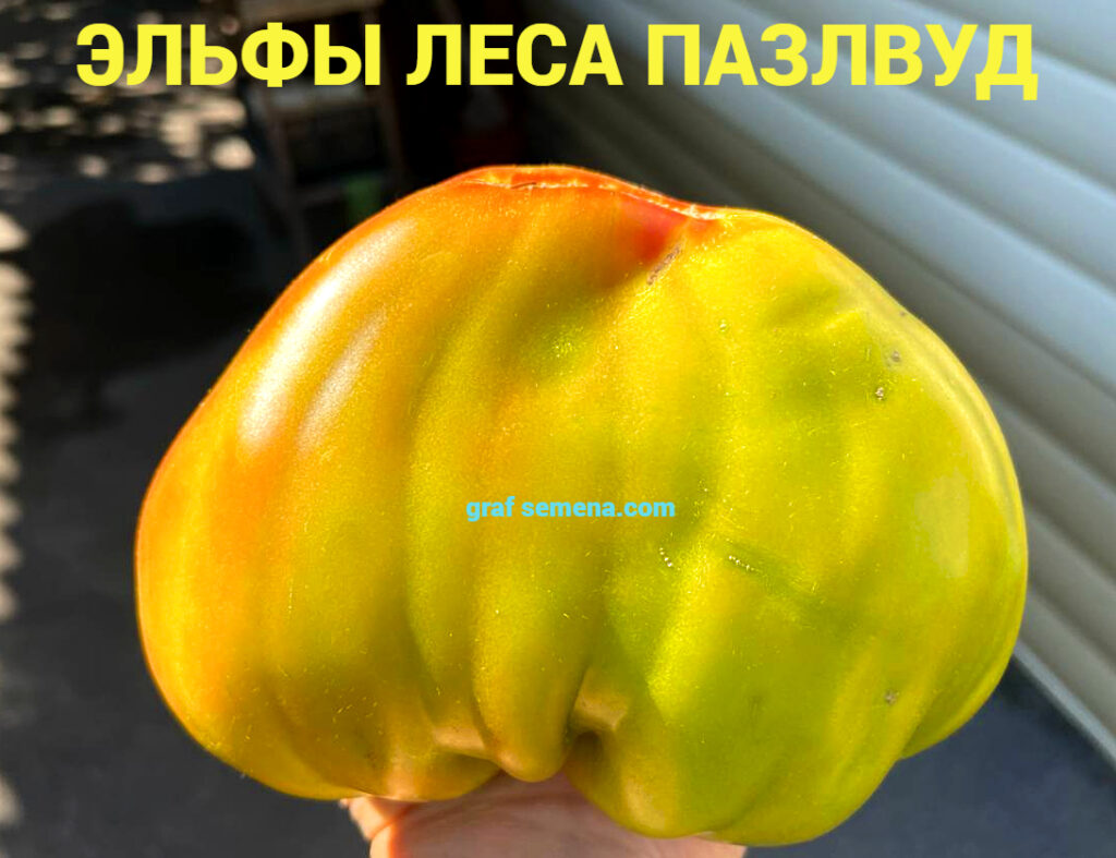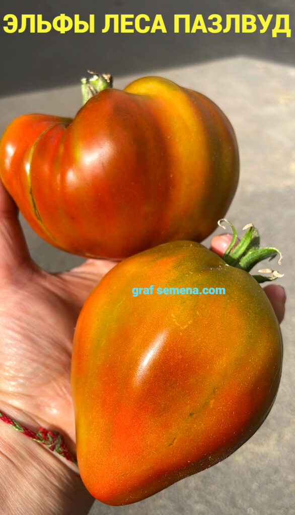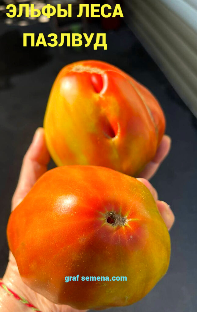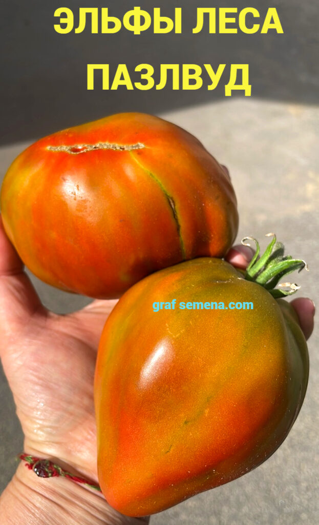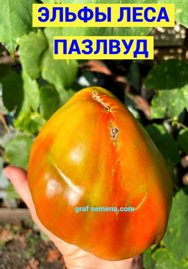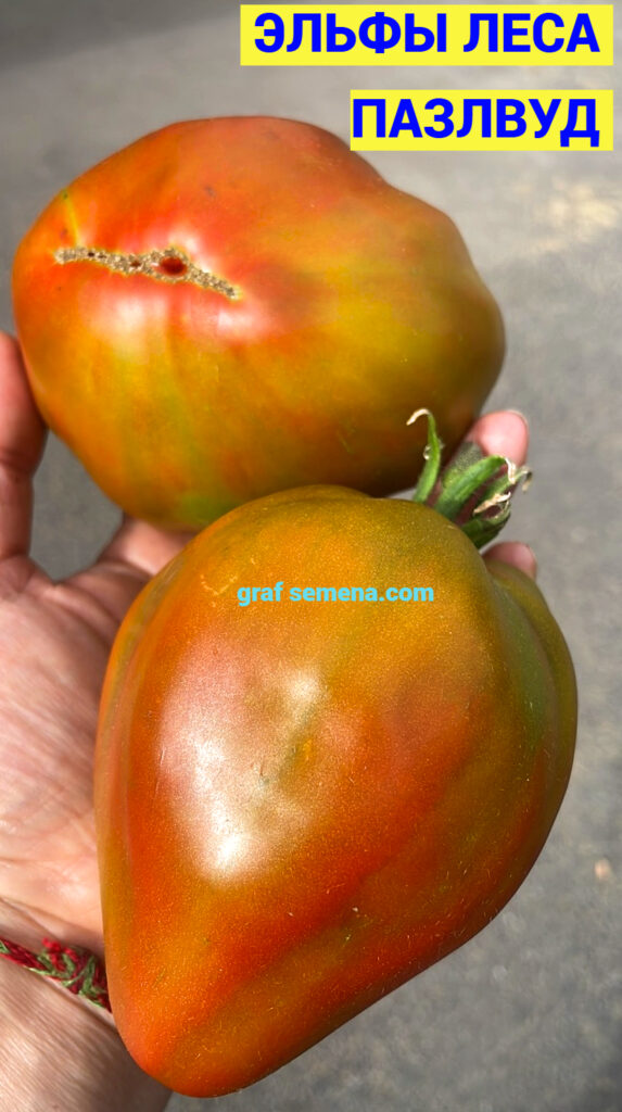 Но этот сорт, ЭЛЬФЫ ЛЕСА ПАЗЛВУД (ELVES OF THE PUZZLEWOOD FOREST), я запомню на всю жизнь, потому что когда еле удерживаешь в руке плод размером с полторы ладони и весом более 1,3 килограмма — равнодушным оставаться просто невозможно! Это чудо чудное и диво дивное! Я следила за ним весь сезон, он не мог не обратить на себя внимание размером своих спеющих плодов. В середине лета был сильный ураган, во время которого первые крупные кисти были обломаны ветром. Именно поэтому я выставляю сорт позже срока его созревания, на самом деле сорт — среднеспелый, не поздний.