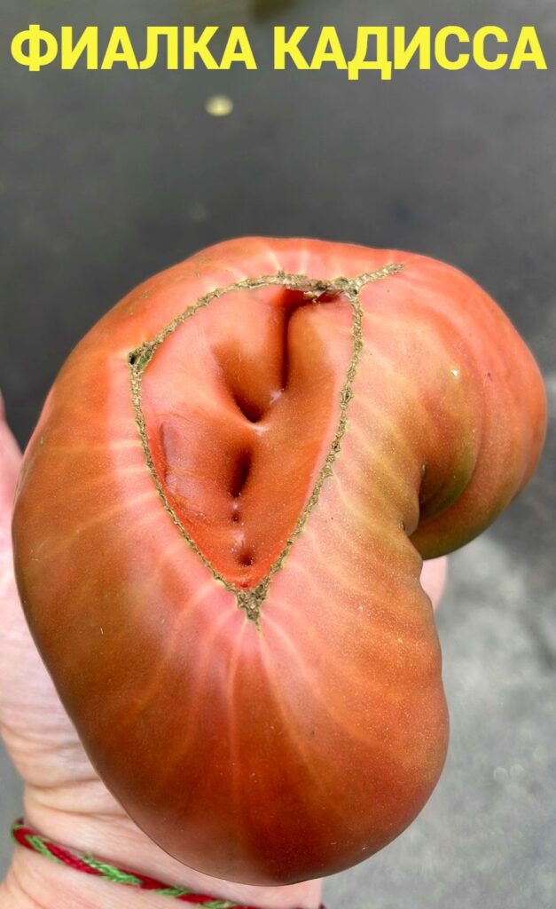 Добавляет очарование еще и форма плодов. Они идеального вида, строго плоско-ребристые, с крупными гранями и пухлыми плечиками. Нет ни намека на трещинку или зеленые твердые участки. Плоды вы съедите полностью, оставите только хвостик. В разрезе плоды имеют шоколадно-пурпурную мякоть с зеленым гелем в семенных камерах.