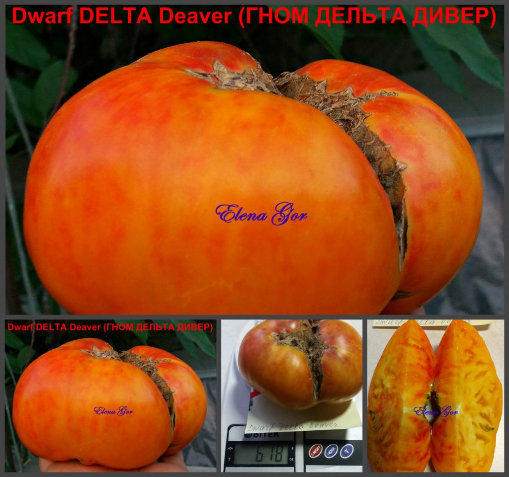 В разрезе мякоть потрясающе ярких цветов: на бронзовой мякоти ярко-красная середина, просто алая! Безумно красивые, любуюсь ими весь сезон. Куст крепкий, стебель толстый, строение плотное, высота совсем не «гнома» — 1,8 метра в ОГ, хотя листья плотные. В кисти 3-4 плода весом 250-300 г, урожай при этом средний. Куст беспроблемный, внимания и пасынкования не требует.
