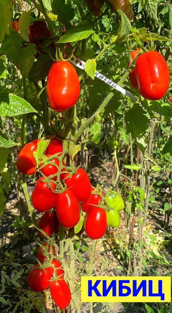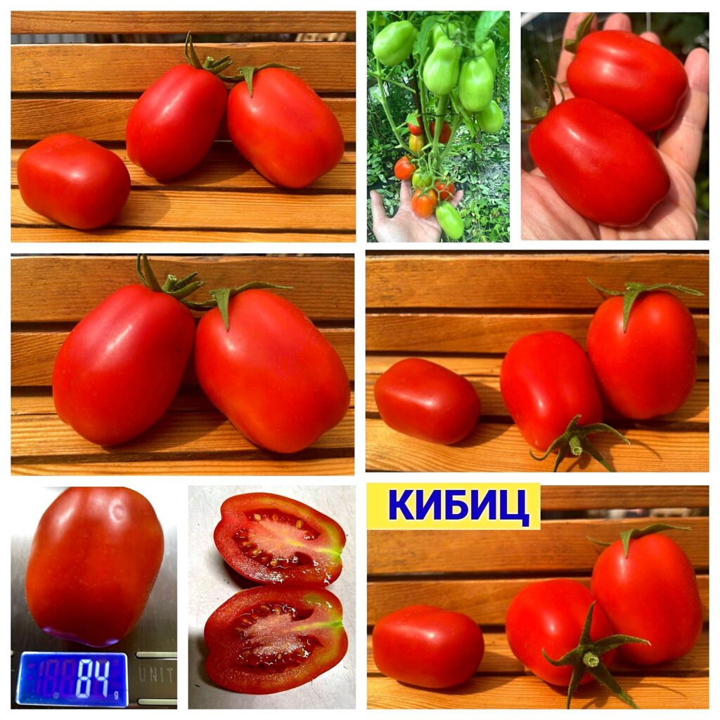 Кибиц — это очень крепкий куст, хорошо облиственный, в кисти 6-8 плодов весом 70-80 грамм. Безусловно сорт очень урожайный. Плоды красивые, яркие, плотные, мясистые, сочные, ароматные, вкусные. Форма — классическая сливка. Ни одной трещинки! Вкус — гармоничный, с балансом сладости и кислинки, сочная плотная мякоть, желейные семенные камеры.