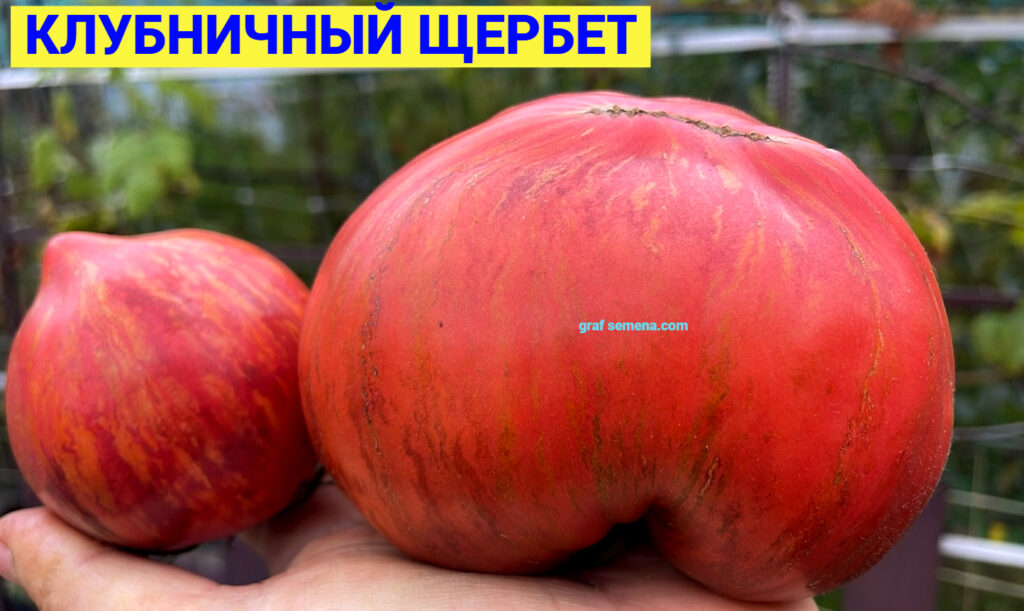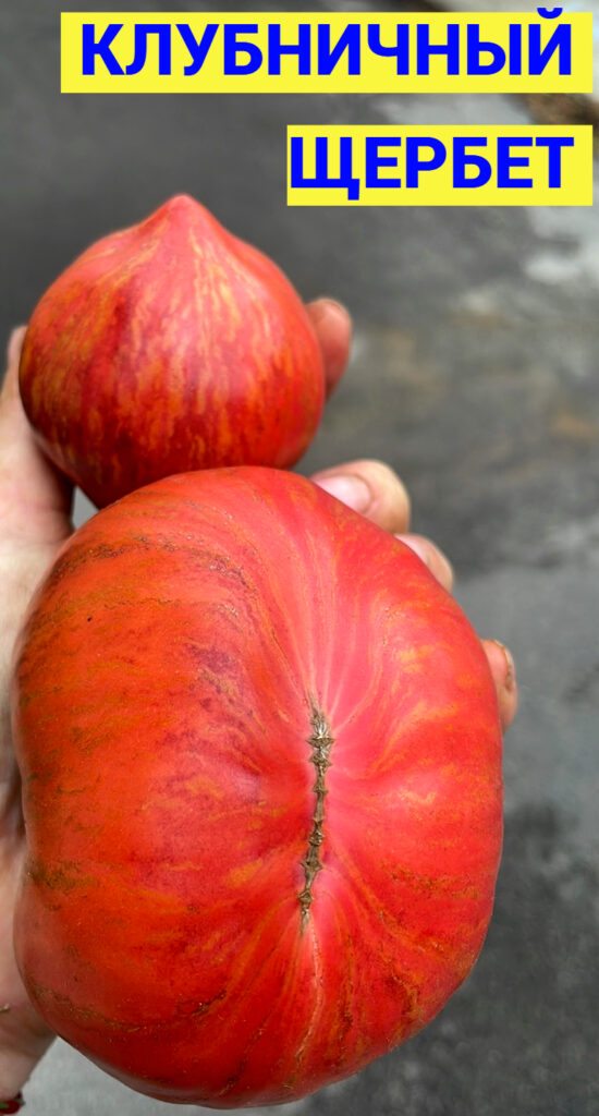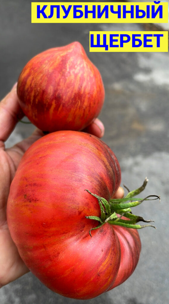 Плоды — малинового цвета с красными и желтыми полосками и штрихами. Форма сердечная с красивым носиком и тонкой кожицей, как клубничка.