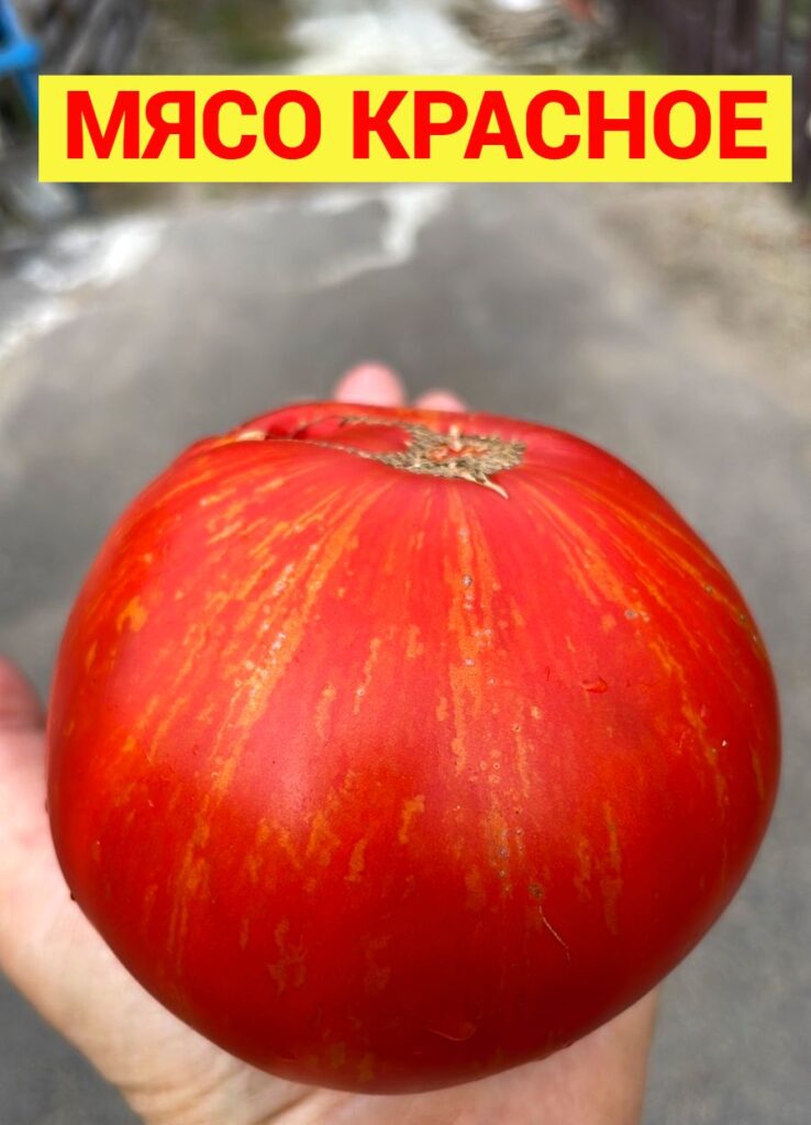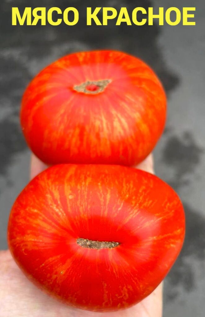 Лучший краснополосый, открытоопыляемый слайсер в селекционной программе Cream of the Crop (TM). Кирпично-красные плоды с зелеными полосками. Красивая красная внутренность. Твердые плоды имеют хороший срок хранения»Согласна с каждым словом. Средне-ранний очень оригинальный товарный бифштекс. Куст крепкий, 1,2 м в открытом грунте, в кисти 4-5 плодов весом 250-350 г.