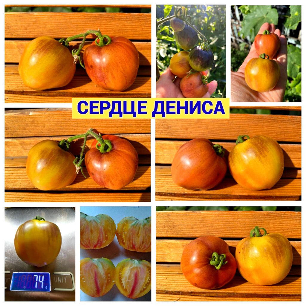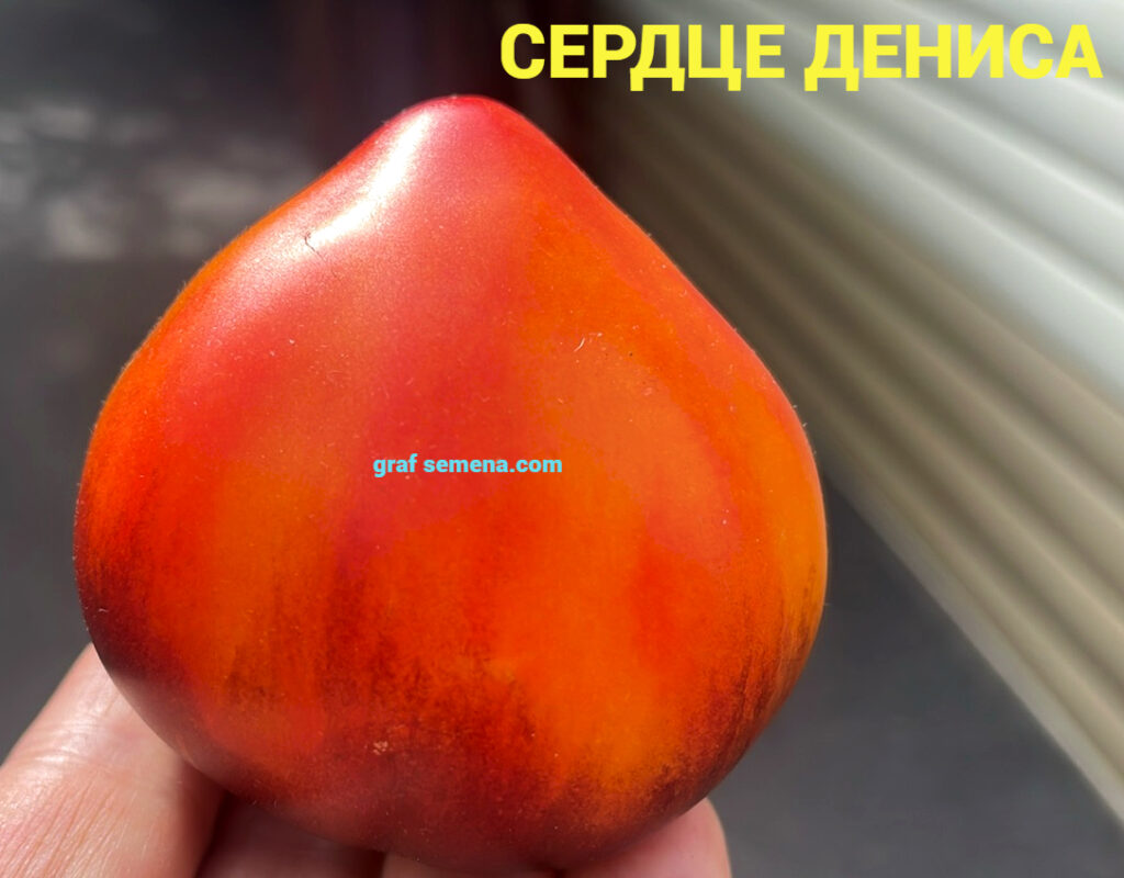 Форма округло-сердечная, слегка вытянутая. Основной цвет — желтый, с розовым румянцем и антоцианом на плечиках. Мякоть насыщенного желтого цвета, с ярким красным галстуком по центру плода.