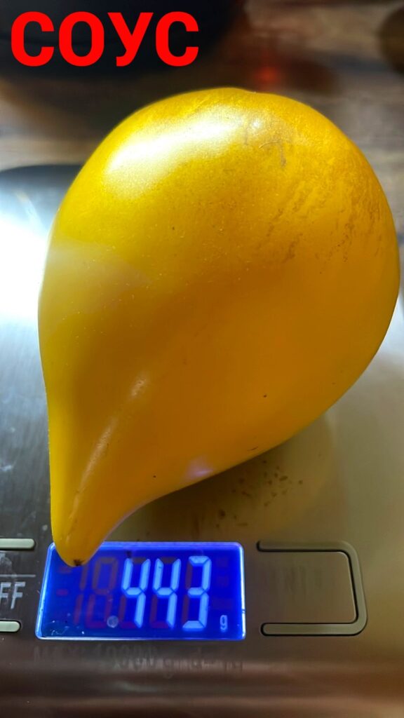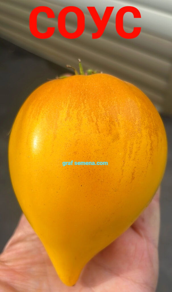 Вкус — замечательный, фруктовый, очень сочный, ароматный, сладкий с легкой кислинкой, очень достойный и тающий во рту! При полной спелости мякоть становится мармеладной, состоящей из одного сока. Семенные камеры очень маленькие и их почти нет. Цвет мякоти — однородный желтый, с едва заметным красным галстуком.