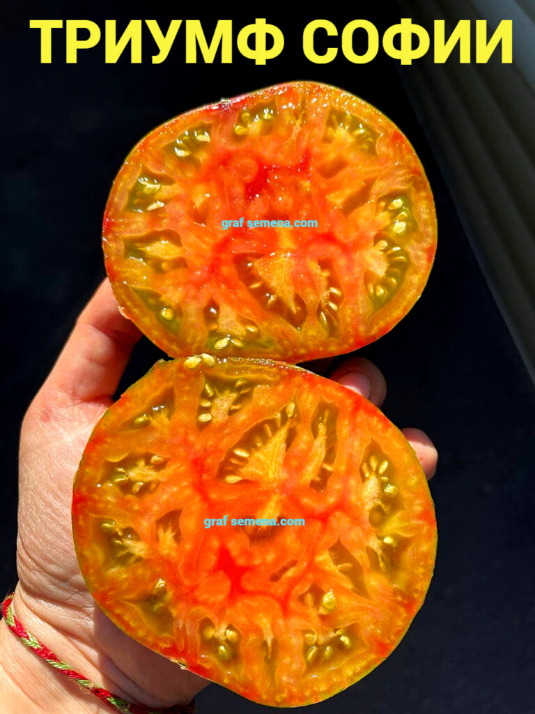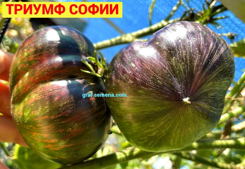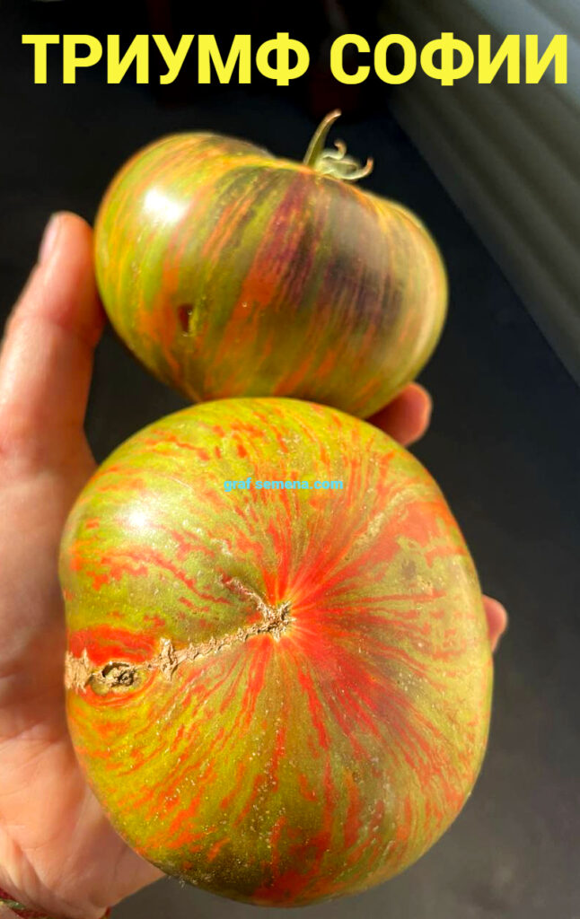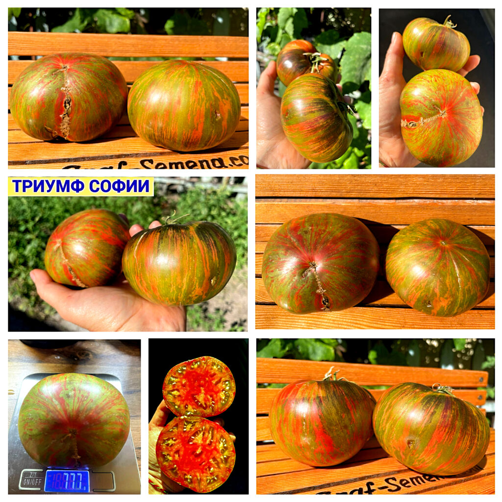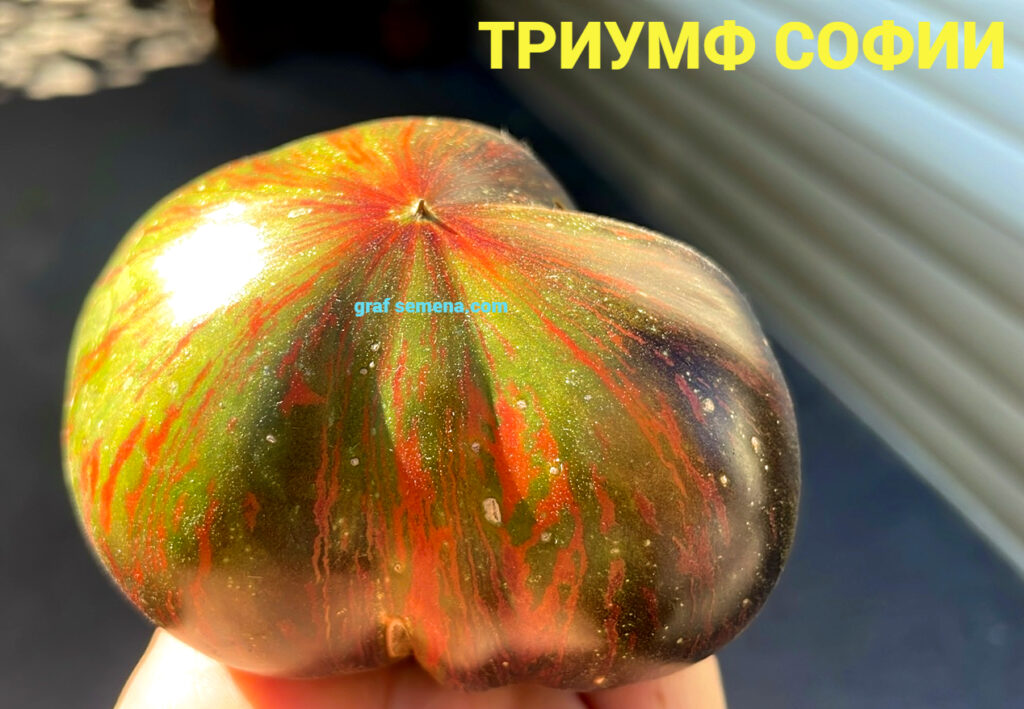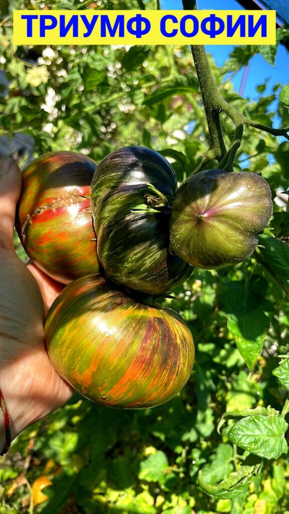 «Триумф Софии Ф6 Практически стабилен, но на данном этапе селекционного отбора могут еще встречаться расщепления. Среднеспелый, куст 1.8м в теплице. Плоды 200-500 и выше грамм, сказочной красоты, высокоплоскоокруглые с клювиком , изумрудные , расписаны узорами малиновыми, красными, желтыми. От такой красоты аж дух захватывает. Мякоть трехцветная, маслянистая, оооочень вкусная. Фаворит моей селекции!!!!!!» Куст индет, крепкий и очень мощный, самый рослый в этом сезоне, 2,3 м в открытом грунте».